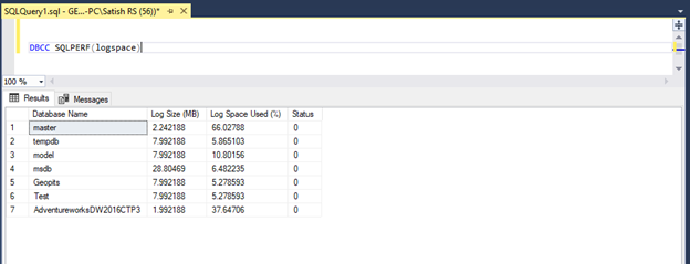 DBCC SQLPERF command provides the transaction log space usage statistics for all databases as shown below figure.