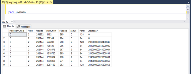 DBCC LOGINFO command provides the important information about structure of the log transaction as shown below figure.