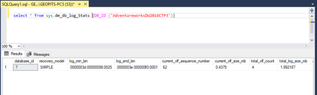 Here I am executing the sys.dm_db_log_stats command with AdventureworksDW2016CTP3 database as shown below snapshot.