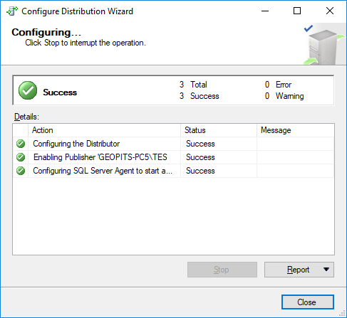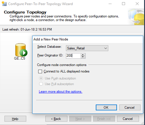 18) Once the topology is configured the below window will give the information about the publisher details and distributor details. Here the important thing to notice is peer-originated id, by default it is set to 100 for the first node.