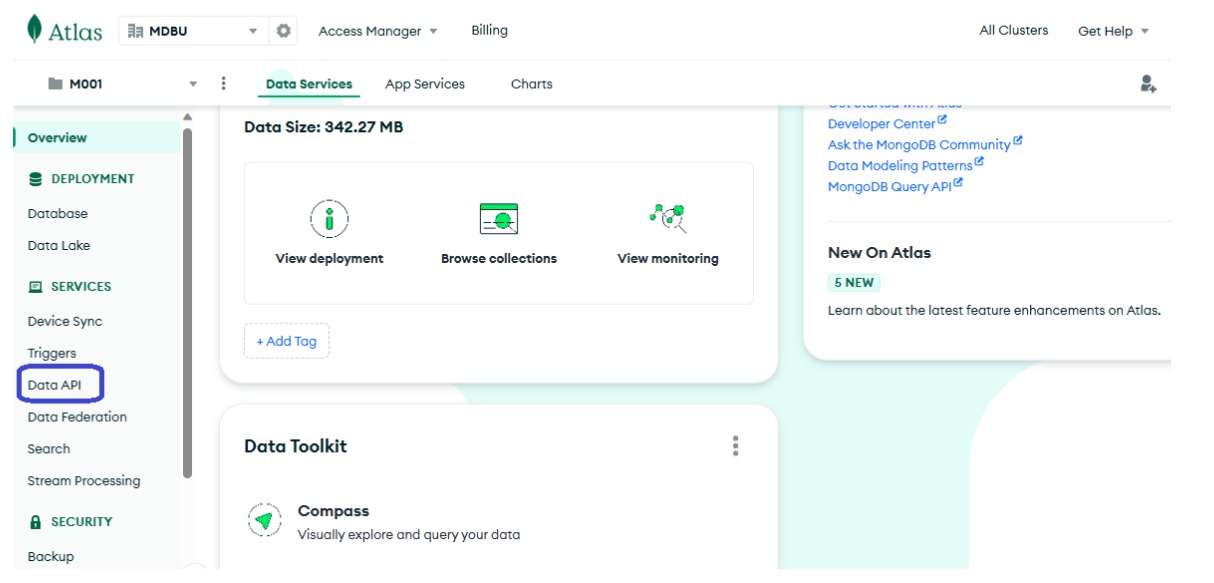 To use the Data API, you should enable it using the MongoDB Atlas UI. Once you login to your cluster, you can see the Data API in the left menu options:
