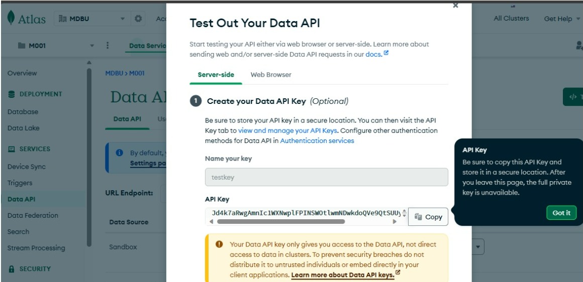 To use the API on the server-side (not from a web browser), and to test it by firing CRUD or aggregation operations on it, you need an API key, which must be kept safe at all times. MongoDB will generate the key once and you must copy it at that time. Remember that whoever has access to the key, can alter the database!