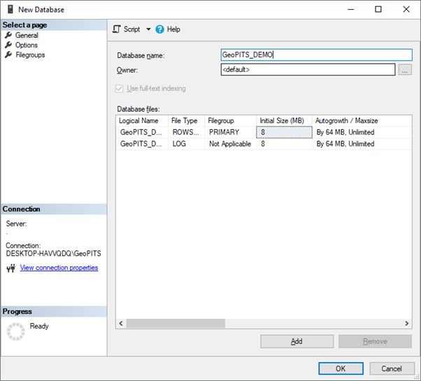 Create a new database with a name of your choice. I have named the DB as GeoPITS_DEMO as shown below.